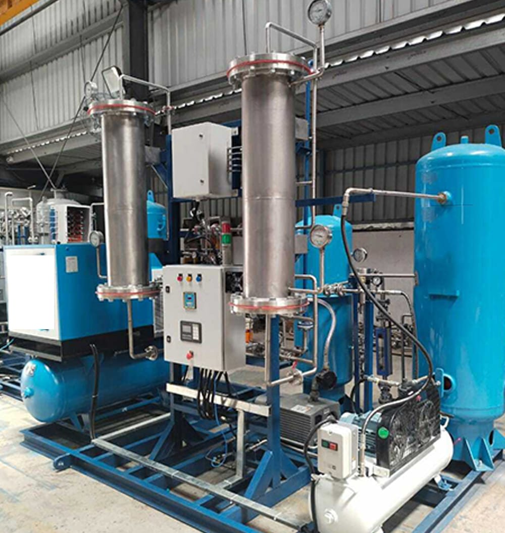 Oxygen PSA process utilized by Medigreen Energy plants is a method of separating air into its two principal components—Nitrogen and oxygen— using adsorption technology at high pressure. Ambient air from the atmosphere is compressed in an Air Compressor up to 116 PSIG and is routed through pre filter to remove particulate material and then sent to Refrigeration dryer system which maintains the refrigeration process at temperature less than dew point (< 3 deg C) to remove moisture present in ambient air. Dry air from refrigeration dryer system is sent to an Air Receiver. Dry air from air receiver is routed through series of filters viz. fine filter and activated carbon filter to safeguard the PSA system from any fine particles and hydrocarbon/oil traces. Clean dry air from activated carbon filter is routed to PSA system for adsorption.